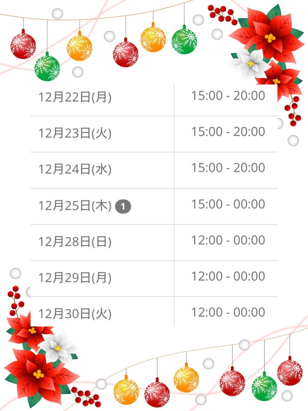 明日(12/23)も、15時~20時まで出勤です♥️