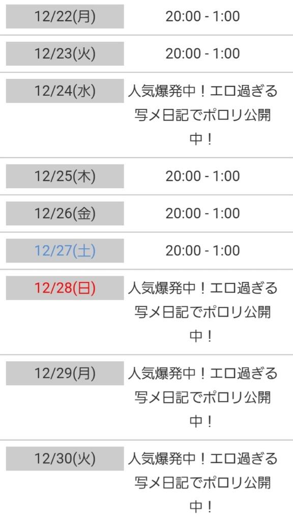 シフトです☆24日(水)•29日(月) 休み28日(日)•30日(火) 未定年始はまたアップします☆お誘いいただけたら喜びまクリマクリスティー♡るり・.♡。*