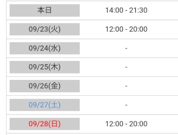23(火.祝日)と28(日)は12時から20時あがりで