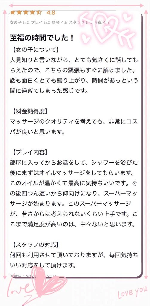 ながさ1066様 クチコミまで書いてもらえてとってもうれしいです☺️💗 ほんとにあっという間の時間でしたね🥹 時間ギリギリまでお話しできたのもすごく楽しかったです ...