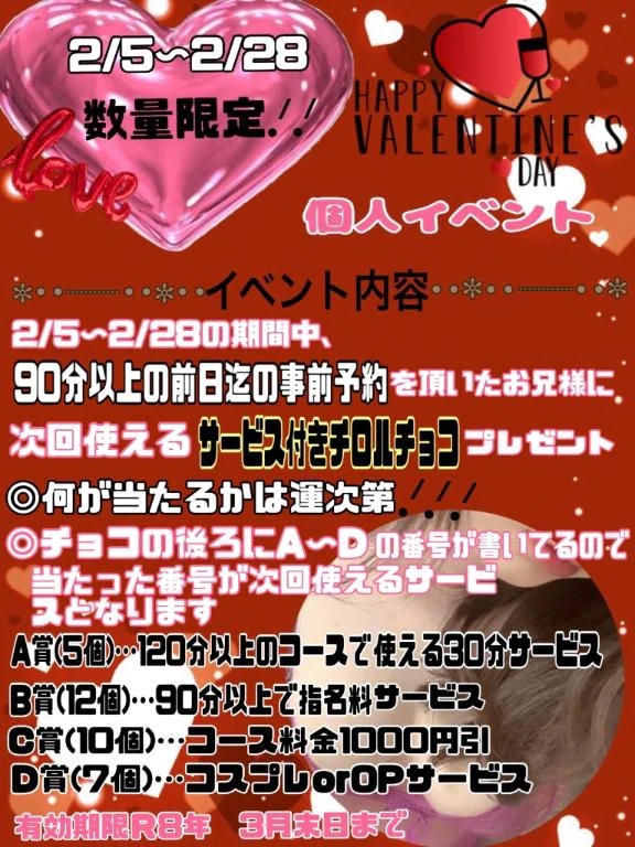 お兄さん達に私から バレンタインのプレゼント🎁🩷 ☃❄2月限定❄️.*˚ 90分以上の前日まで事前予約の お兄さん達 に サービス付チロルチョコくじ 開催中🥰💓 見ないで選んでもらうよ🥹🙌🏻 当たっ...