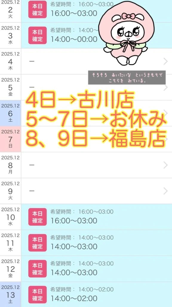 こんにちは☀️ 毎度ギリギリですみません🙇♀️💦 シフト更新しました✅ ◾️4日(木)→古川店出勤(周年祭) ◾️5日(金)~7日(日)→お休み ◾️8(月)、9日(火)→福島店出勤 そして! 12月...
