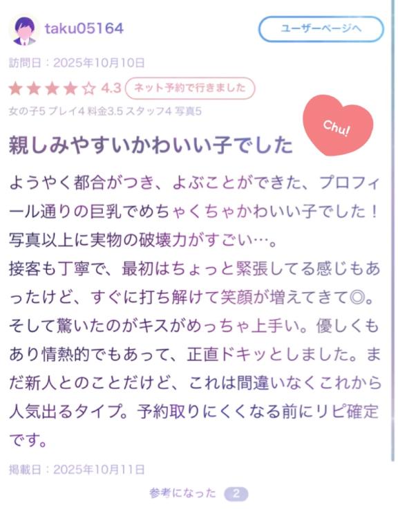 taku05164さん 🩷 口コミありがとうございます🌸 先日は呼んでくださりありがとうでした! 破壊力がすごいって褒めてもらえて すごくすごくすっっごく嬉しいです♡...
