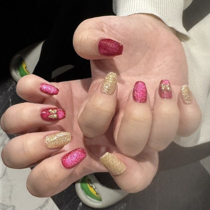 クリスマスと新年のことを考えて、赤とゴールドの組み合わせに✨マグネットとラメを入れてもらって、角度によってきらきら光る感じがとても綺麗!!!