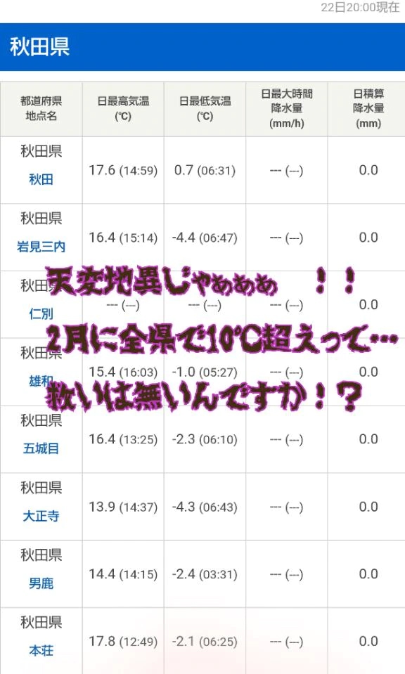 2月の秋田県でこんな気温なんて、昔だったら『天変地異』と呼ばれるレベルの高温ですって💦