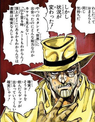 花京院の命をとしたダイイングメッセージを理解したジョセフは、落ち着け…落ち着いて考えるんだ わしにはパニックという言葉はないと頭の中で考えながら、DIOへの反撃の糸口を探るのだった